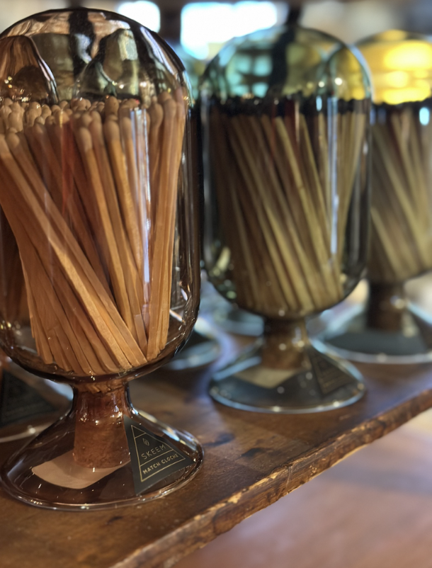 Alluding to olive groves, amber sun, and sweet, mulberry wine, our newest Match Cloches are rich with deep shades of earth-toned glass. Our Match Cloches are inspired by vintage glass domes used to protect emerging seedlings, made with handblown glass and fitted with a cork to stylishly hold an assortment of matchsticks. A striker strip on the glass adds functionality, and the delicate vessels can be reused to display treasures and curiosities.