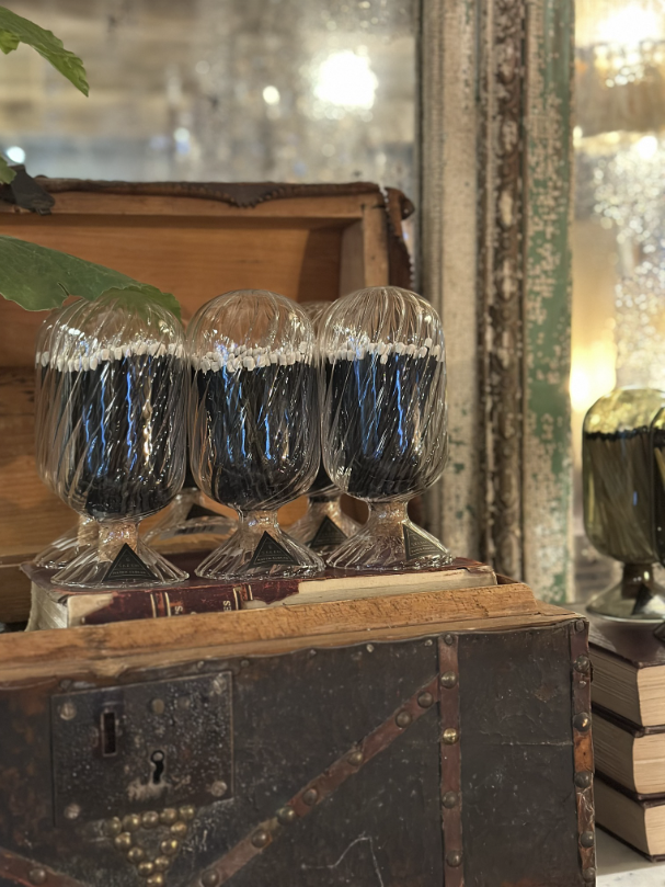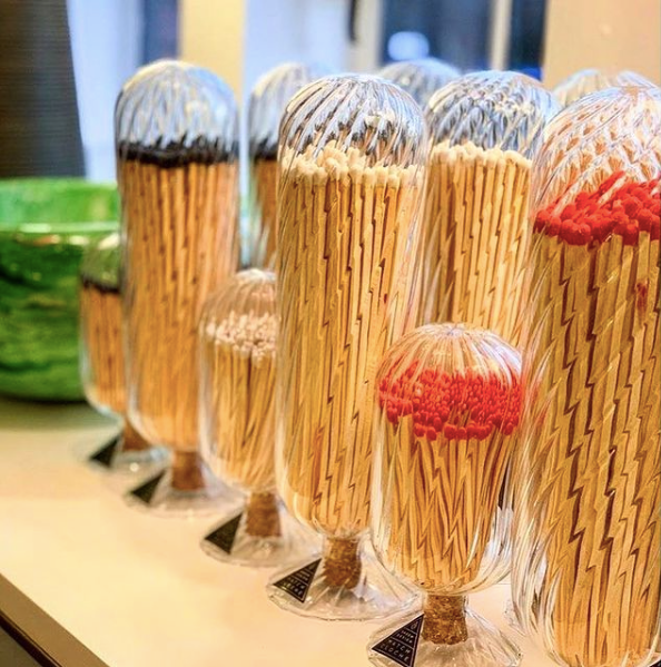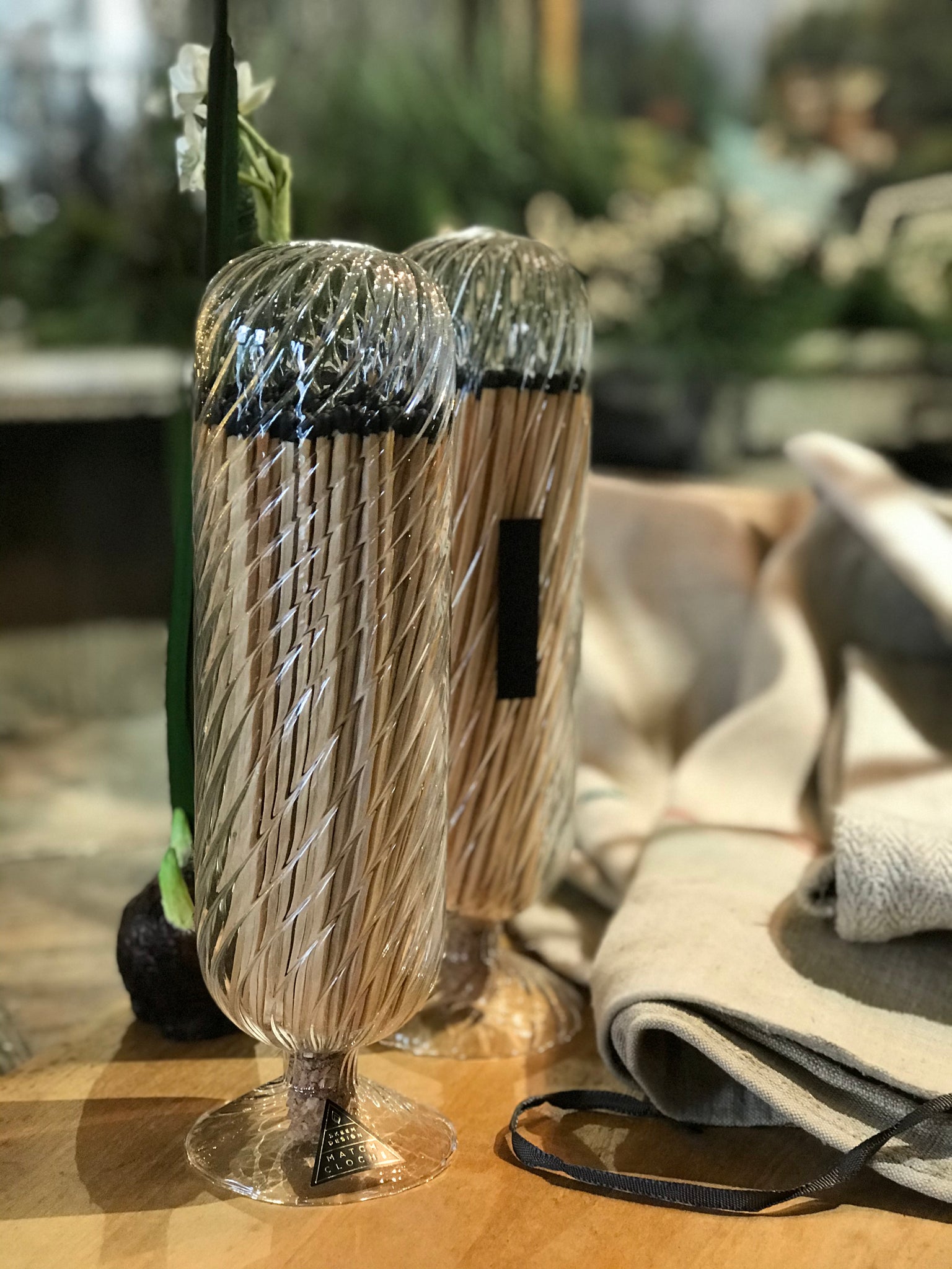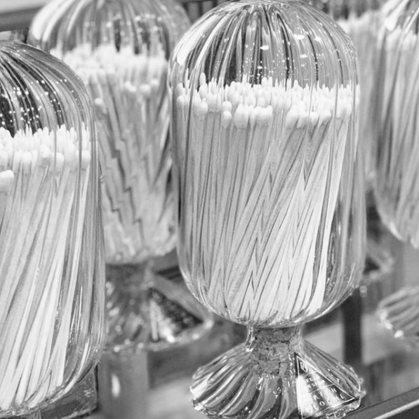 Our captivating Helix Match Cloche evokes a sense luxury with a spiraling glass detail that envelops an assortment of matches inside, like a delicate display case for an eye-catching treasure. Contrary to the other styles in our Helix collection, Tuxedo features black-stemmed matches with white tips: a black-tie rendition that demands all attention.