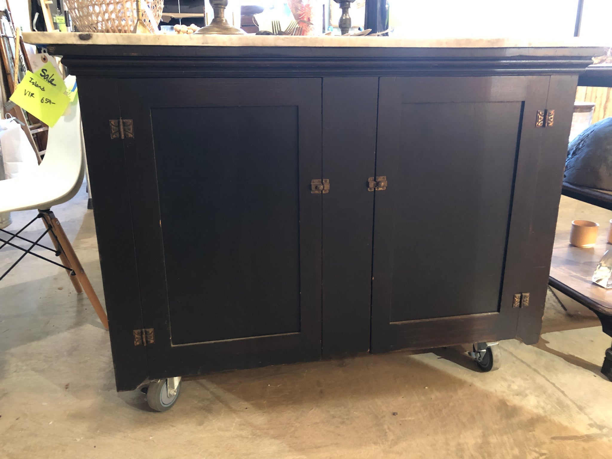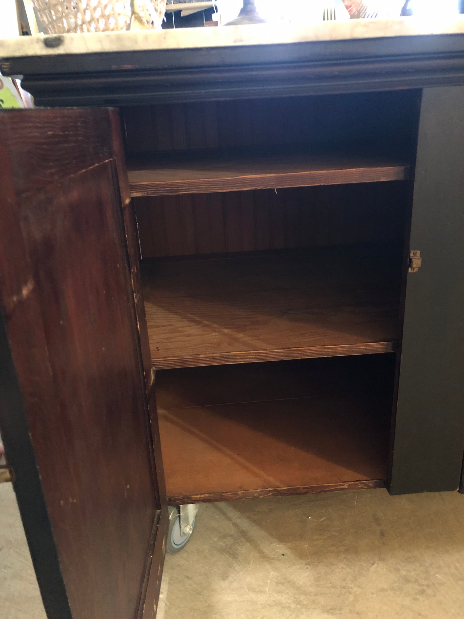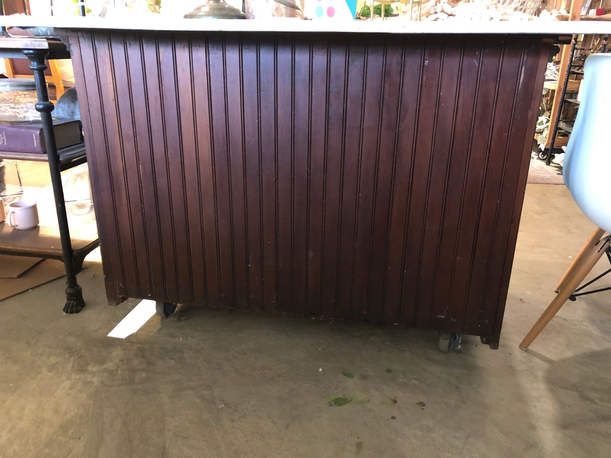 Meet your new favorite entertaining companion! This charming vintage island/bar features a gorgeous marble top that's ready for cocktails, charcuterie, or whatever you're serving. The adorable beadboard front adds cottage-style charm, while the spacious interior keeps all your bar essentials within arm's reach. Best part? Brand-new wheels with brakes mean you can roll this beauty wherever the party's happening—no more stuck-in-one-spot situations. Sophisticated style with a fun, functional twist.