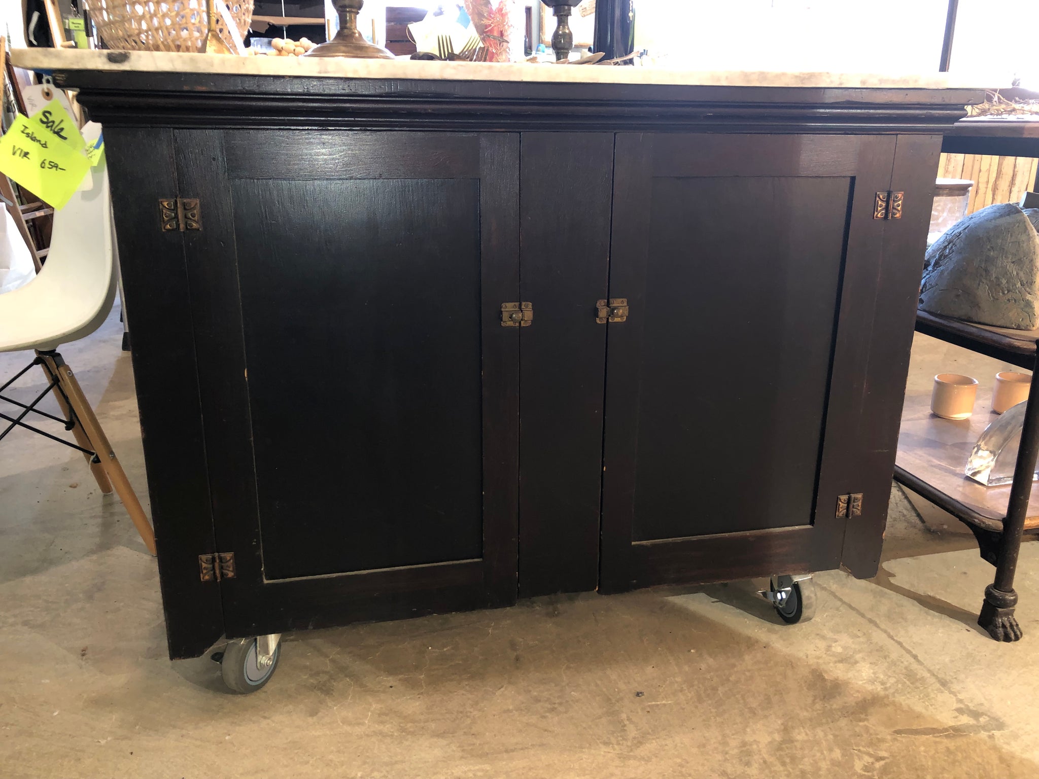 Wood and metal. Removable marble top. 34.5"d x 50"w x 35"h.