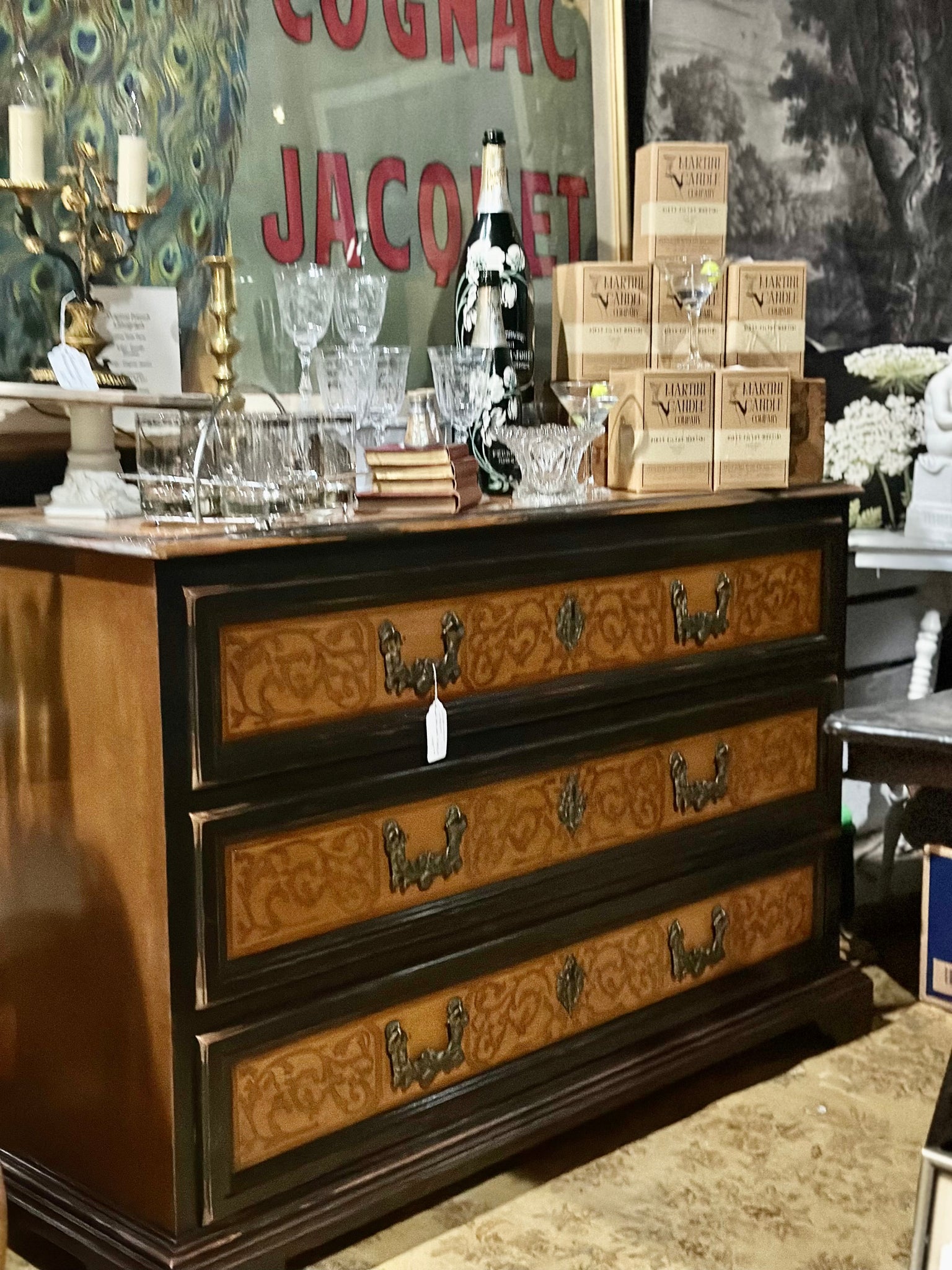 High Quality Chest of Drawers with Scrolling Foliate Inlay on Drawer Fronts and Ebonized and Distressed Frame.
