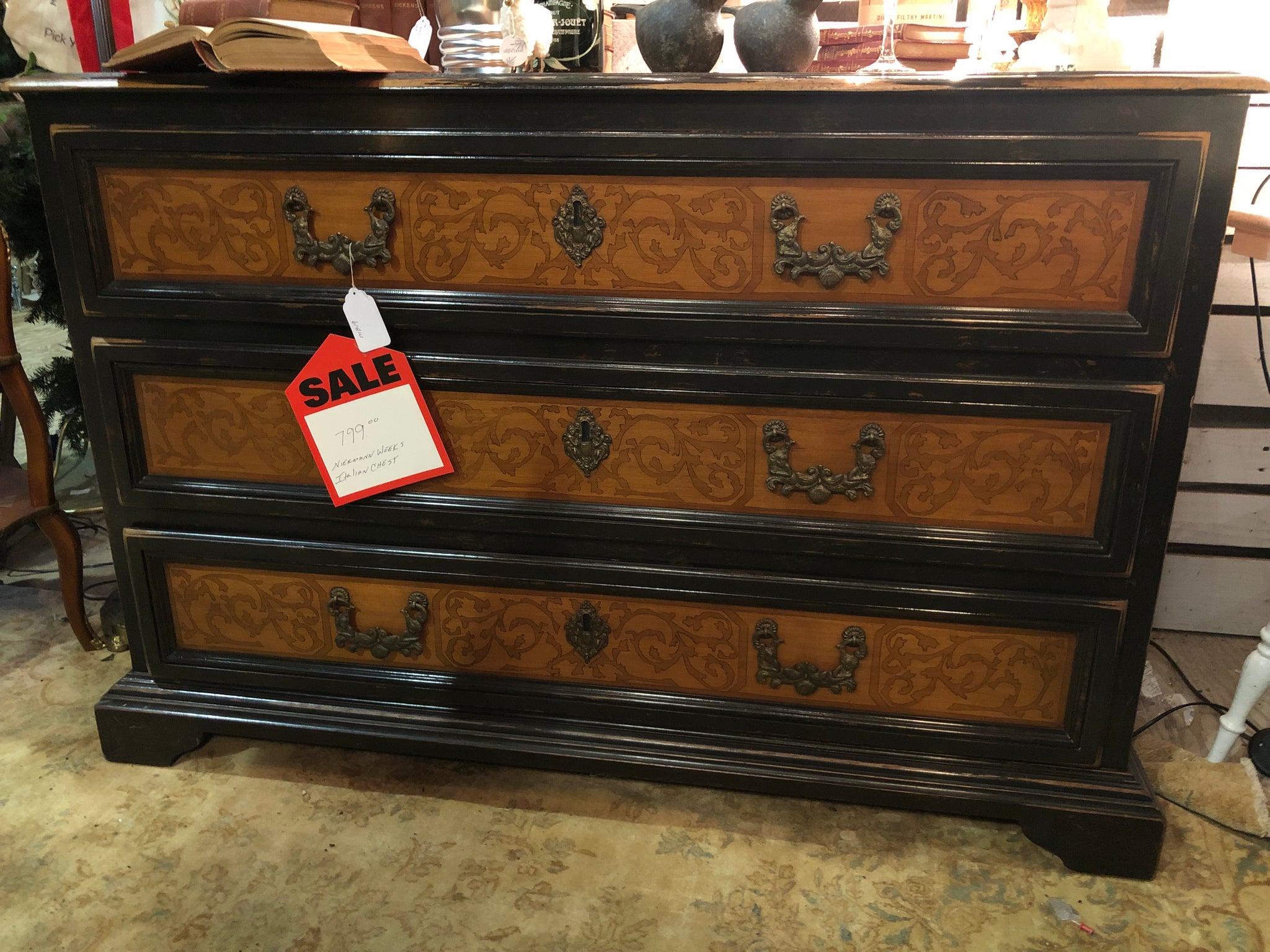 This exquisite chest of drawers showcases refined craftsmanship with its scrolling foliate inlay adorning each drawer front, creating an elegant focal point in any room. The ebonized and distressed frame imparts a distinguished, timeworn character that speaks to both heritage and contemporary design sensibilities. A statement piece that seamlessly marries ornamental detail with functional storage, this Niermann Weeks creation elevates bedroom or living spaces with understated luxury and enduring style.